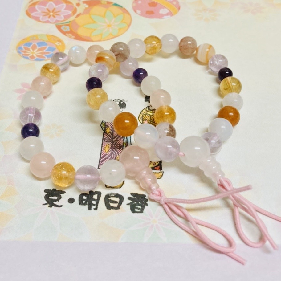 | 腕輪念珠作り体験 1名様~ ¥4,000~ R8.3月まで \4,600~ R8.4月より お念珠を簡易化したもので、魔除け厄除けのお守りにも使われる腕輪念珠。 法事で使うお念珠と違い、腕にはめることができます。 お好きな天然石でご予算に合わせてお作りいただけます。 |